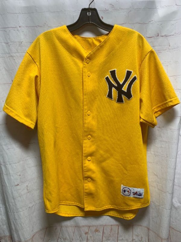 Majestic baseball jersey, short sleeves, button-up, v-neck, athletic net fabric, New York Yankees, MLB, appliqued left chest team logo, yellow/black/white, size L As is