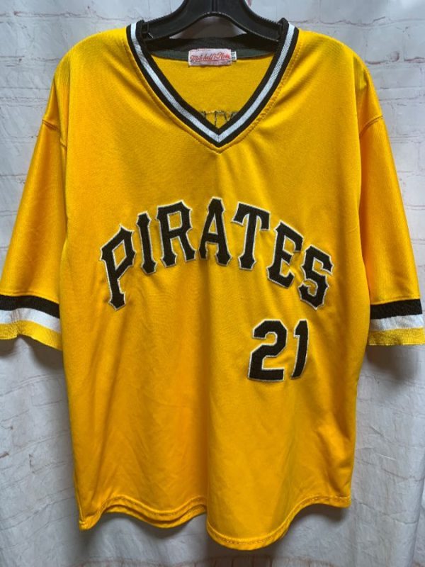 Mitchell & Ness baseball jersey, pullover, v-neck, striped trim, striped sleeves, Pittsburgh Pirates, #21, Clemente, appliqued lettering/numbers front & back, MLB, yellow/white/black, size L