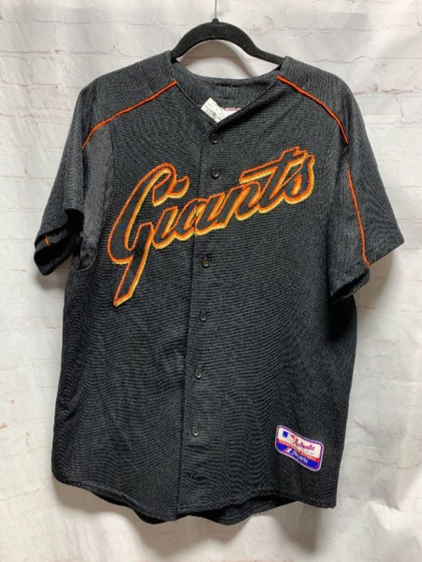 Majestic baseball jersey, short sleeves, button-up, v-neck, San Francisco Giants, #25 Bonds, applique team/player name & number, black/orange/gold/white, size M As is