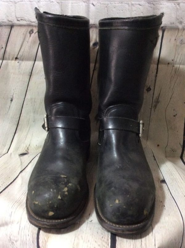 Chippewa boots, motorcycle style, calf high, strap with buckle across front, Vibram soles, black, size 10 men’s