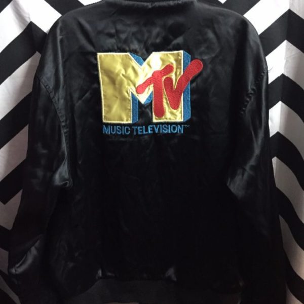 Baseball style jacket, satin, button-up with snaps, MTV, black/gold/red, size L