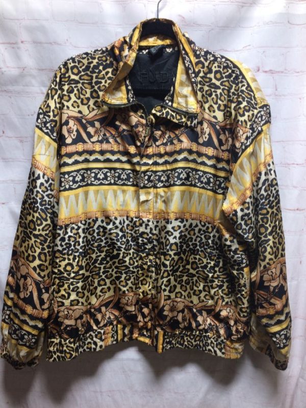 Fuda windbreaker jacket, silk, zip-up, polyester lining, multi-pattern horizontal design with Cheetah/floral/triangles, black/white/tan/gold/brown, size L