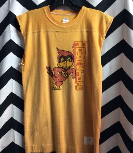 Muscle T-shirt, Iowa State Mascot, cutoff sleeves, yellow/red, size M as is