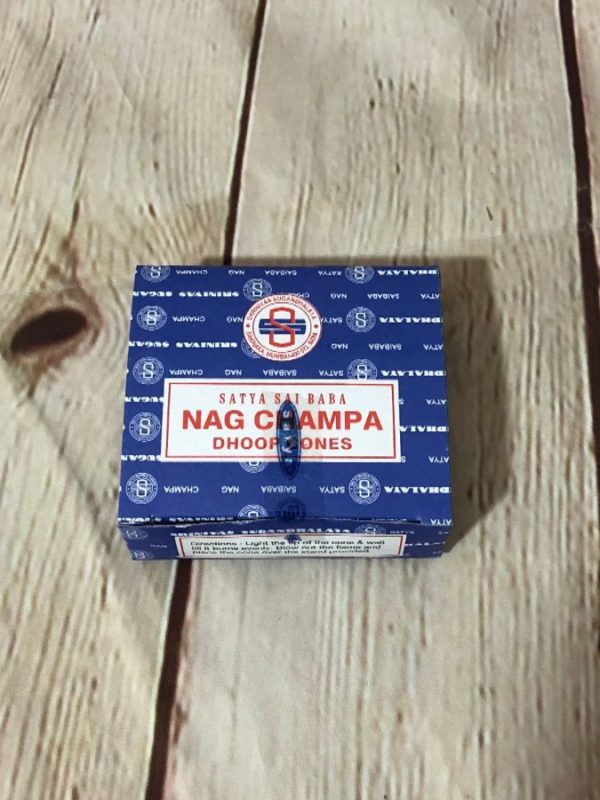 INCENSE CONES, NAG CHAMPA, SATYA SAI BABBA, 1 BOX, 12 DHOOP STYLE INCENSE CONES WITH STAND, MADE IN INDIA