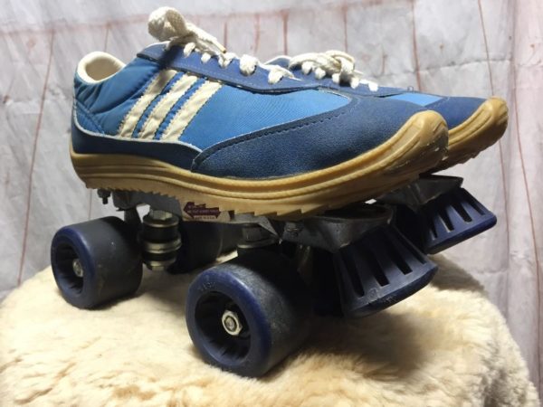 Classic Nash Cruisers Roller Skates, leather trim, Adidas look side stripes, sneaker type shoes on wheels, lace-up, heavy duty toe stops, blue/white, size 7 As is