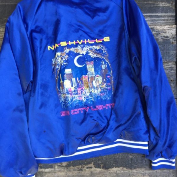 Sports jacket, satin, button-up, Nashville Big City Lights, screen printed back design, striped trim, blue/white/multi, size XL