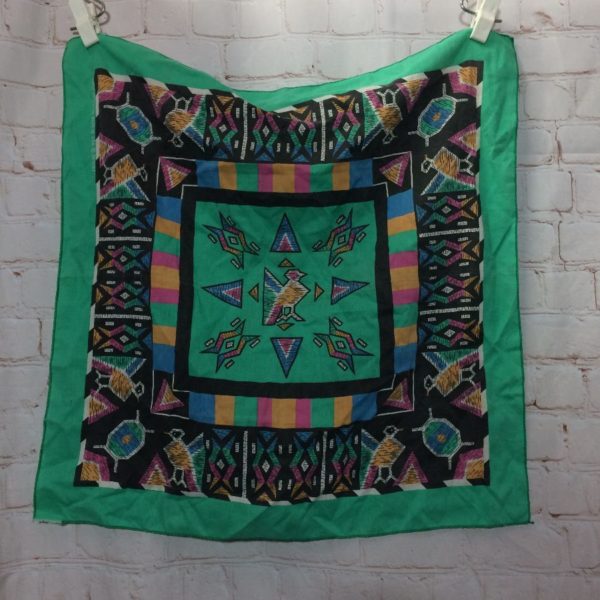 Bandana, square shape, Native American design birds & triangles & abstract shapes print, black/blue/green/purple/gold/white