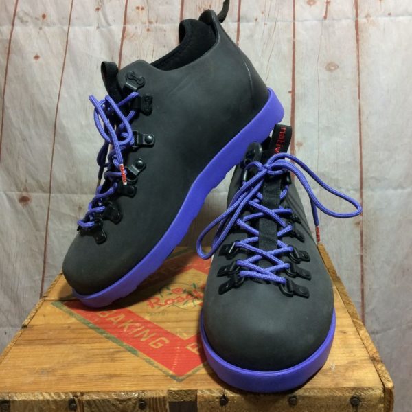 Native hiking boot, lace-up, low-tops, rubberized, black/purple, size 9