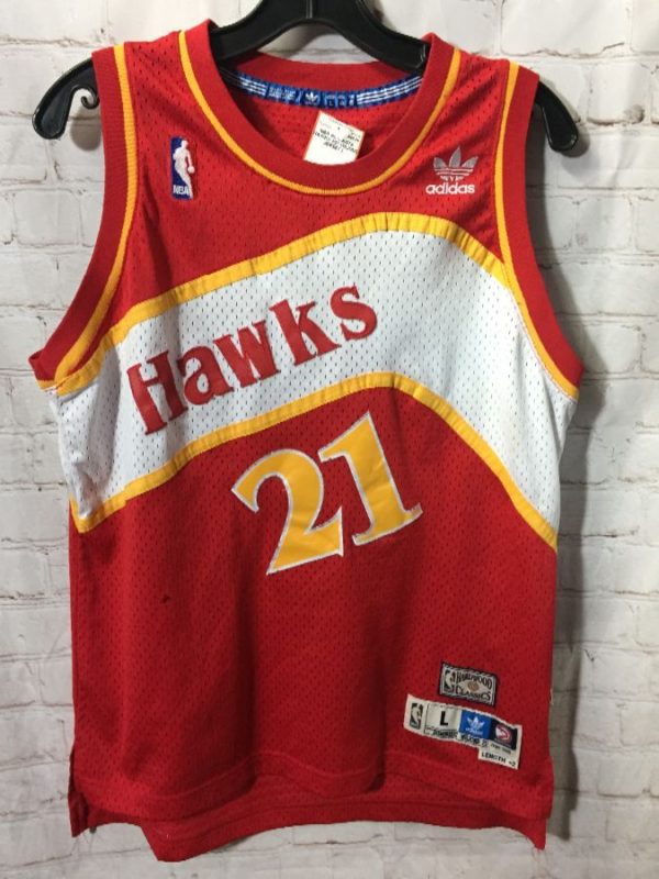 Adidas Hardwood Classic baseball jersey, tank top style, net type fabric, Atlanta Hawks, #21 Wilkins, NBA, red/white/yellow, size L
