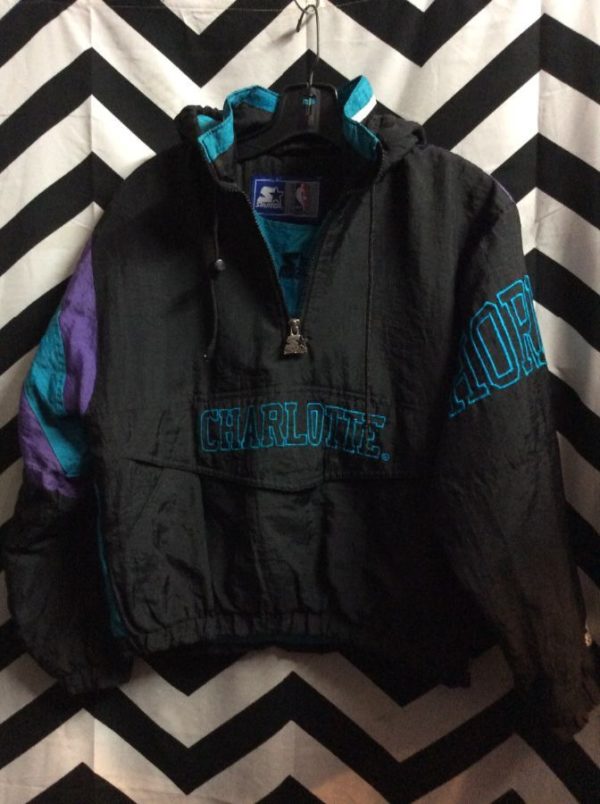 Starter jacket, pullover, 1/4 zip-up, hooded, Charlotte Hornets, color block design, embroidered team logo & lettering on front & arm, NBA, black/turq/purple, size M