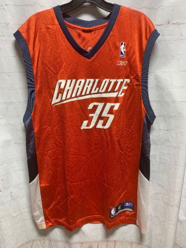 Reebok basketball jersey, tank top, v-neck, striped trim on neck/arms/down sides, Charlotte Bobcats, #35 Morrison, screen printed numbers/letters front & back, small embroidered logos, NBA, orange/white/navy blue, size M