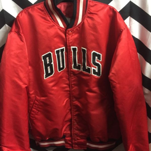 Starter jacket, button-up, Chicago Bulls, Bulls lettering full front, striped sleeves & neck, NBA, red/white/black, size XL as is