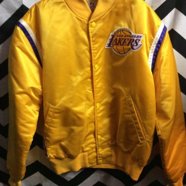 Starter jacket, button-up, LA Lakers, team patches, NBA, yellow/purple/white