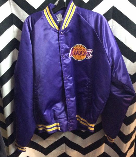Chalkline baseball style jacket, satin, button-up, Los Angeles Lakers, chest logo and lettering across back, purple/yellow, size XL