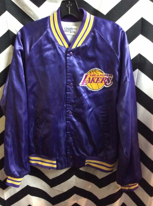 LOS ANGELES LAKERS CHALKLINE SATIN SPORTS JACKET W/LETTERS ON BACK AND TEAM LOGO FRONT LEFT CHEST