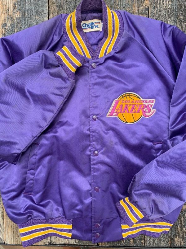 Chalkline sports jacket, satin, button-up with snaps, striped knit trim on collar/cuffs/hem, Los Angeles Lakers, NBA, appliqued back lettering, embroidered left front chest logo, blue/purple/yellow/purple/white, size L