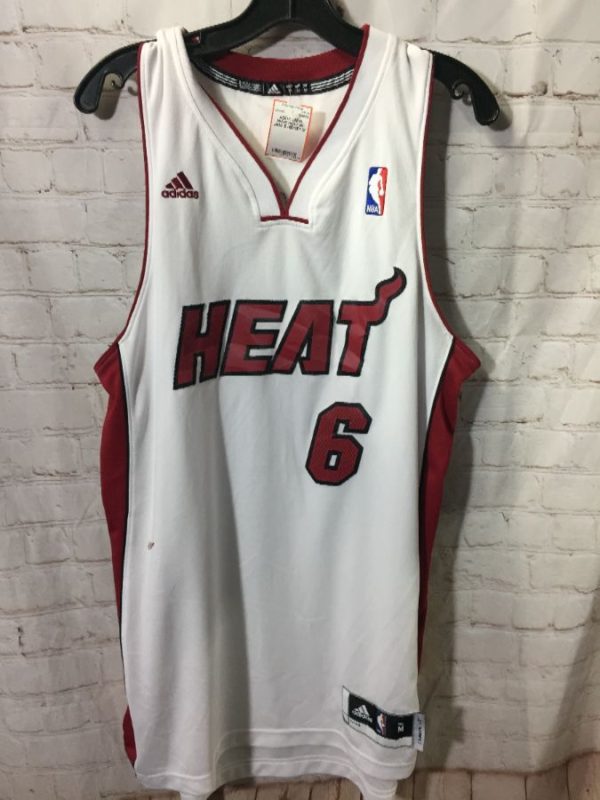 ADIDAS BASKETBALL JERSEY, TANK TOP STYLE, MIAMI HEAT, #6 JAMES, VERTICAL SIDE STRIPES, SCREEN PRINTED FRONT & BACK, WHITE/MAROON/BLACK, SIZE M