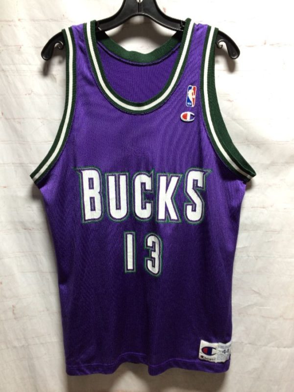 Champion basketball jersey, pullover, striped trim, Milwaukee Bucks #13 Robinson, screen printed lettering/numbers, embroidered patches, purple/black/white, size L