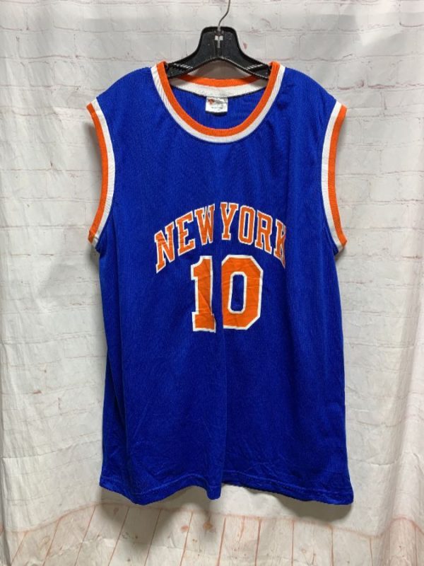 Basketball jersey, polyester, pullover, tank top, New York Knicks, #10 Frazier, screen printed front basketball graphic/numbers/letters & numbers/letters in back, autograph, blue/orange/white, size L