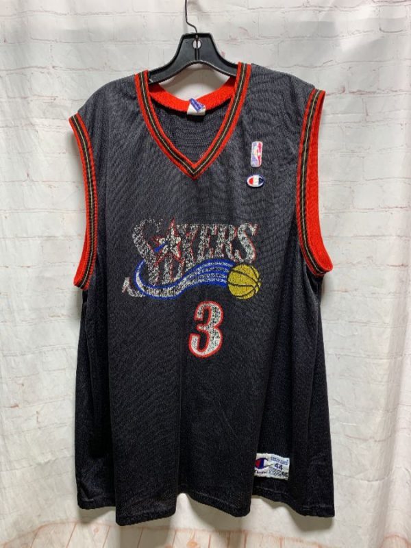 Champion basketball jersey, pullover, tank top, v-neck, stripe trimmed arms & neck, Philadelphia 76er’s, Sixer’s #3 Iverson, screen printed front graphic/lettering & back letters/number, NBA, black/red/blue/gold/yellow/white, size L