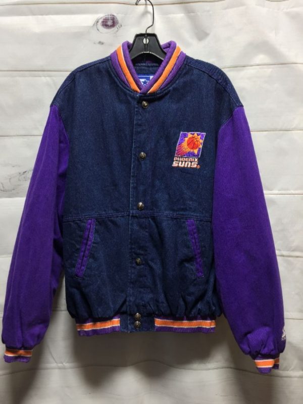 STARTER VARSITY STYLE DENIM SPORTS JACKET, BUTTON-UP, SNAPS, PHOENIX SUNS, EMBROIDERED SMALL LEFT CHEST & LARGE BACK DESIGNS, BLUE/PURPLE/ORANGE/GOLD/WHITE, SIZE M