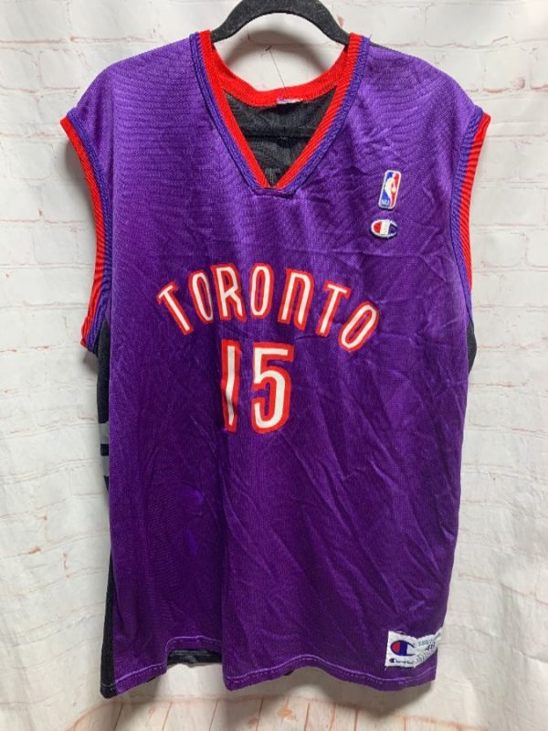 Champion basketball jersey, pullover, sleeveless with striped trim, v-neck, ringer Tee, athletic mesh fabric,Toronto Raptors, Vince Carter #15, contrasting back panel and sides, horizontal stripes on sides, NBA, red/white/purple/black, size XL