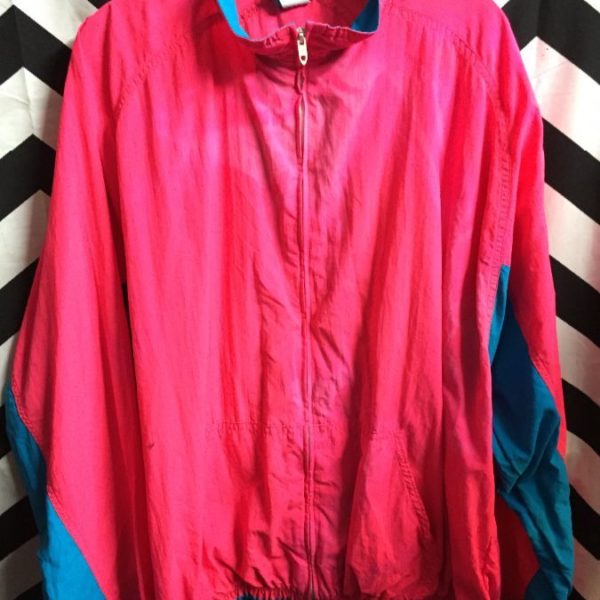 Windbreaker jacket, zip-up, color block design, day-glow colors, sun bleached, deadstock, pink/blue, size XL as is