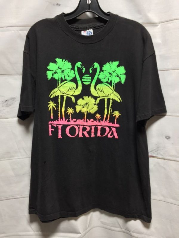 Hanes T-shirt, cotton, Florida, neon colors, Puff ink screen printed flamingo & palm tree front design, black/neon green/yellow/neon pink, size L
