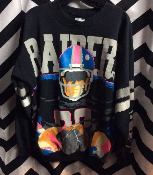 Pullover sweatshirt, Raiders, screen printed design and logo, striped arms, neon colors, black/gray/multi