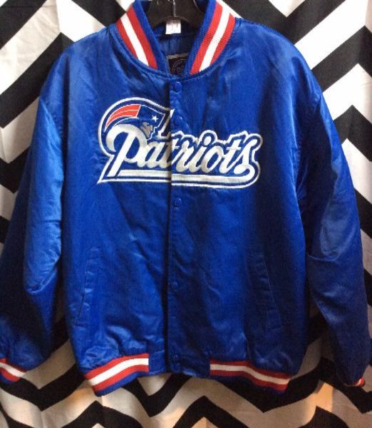 New England Patriots baseball style jacket, satin, button-up, embroidered front design, red/white/blue, size XL
