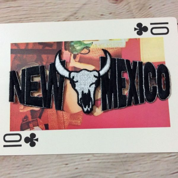 BW embroidered patch, New Mexico with cow skull in center, black/white