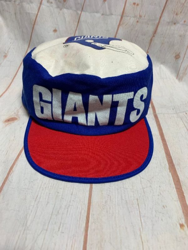 Painters cap, New York Giants, contrasting bill, screen printed lettering all sides & helmet on top, elastic back, red/white/blue, size adjustable