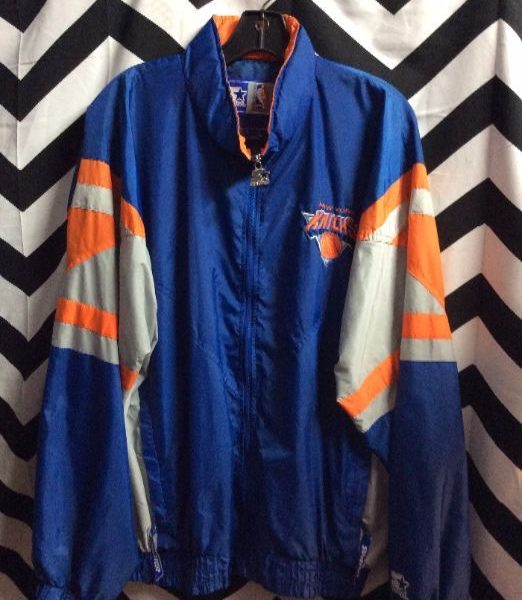 Starter sports jacket, zip-up, New York Knicks, embroidered front chest logo and lettering on full back, blue/orange