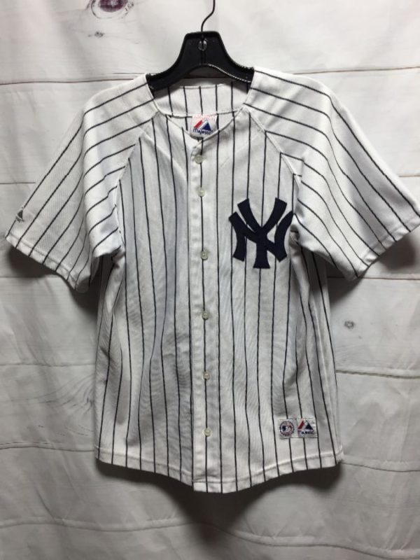Genuine Merchandise by Majestic baseball jersey, short sleeves, button-up, pinstriped fabric, New York Yankees, Jeter #2, appliqued letters & number designs front & back, sleeve logo, white/navy blue, size 14/16 youth As is