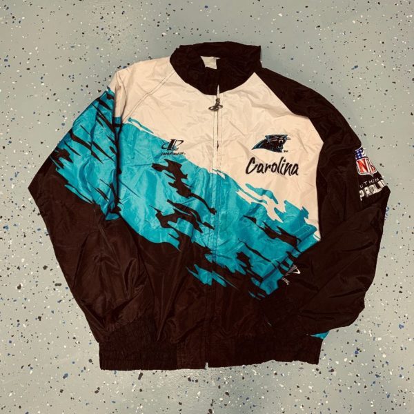 Logo Athletic windbreaker jacket, zip-up, Carolina Panthers, painterly diagonally striped design, appliqued left chest logo & back lettered logo, authentic Proline, NFL, black/teal/off-white, size XL