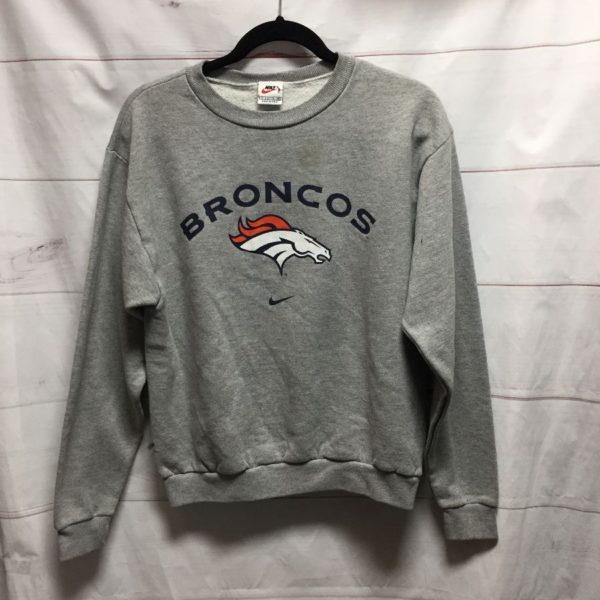 NIKE SPORTS SWEATSHIRT, PULLOVER, CREW-NECK, BRONCOS, SCREEN PRINTED FRONT LOGO WITH HORSE GRAPHIC & LETTERING, NFL PRO LINE, GRAY/BLACK, SIZE L AS IS