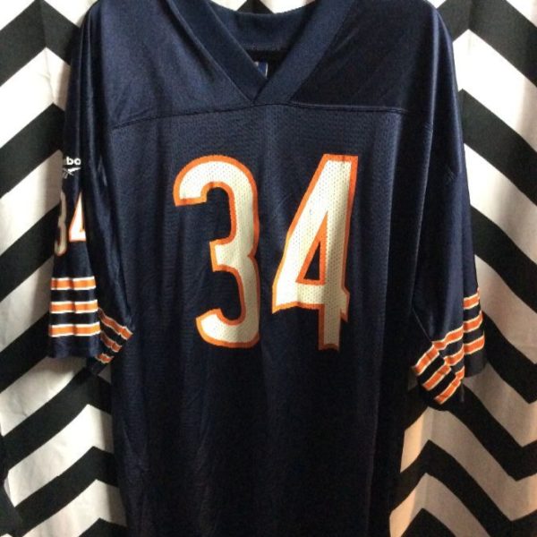 Reebok throwback football jersey, Chicago Bears, #34 Walter Payton, screen printed numbers & lettering front & back, striped design on sleeves, NFL, navy/white/orange, size XL