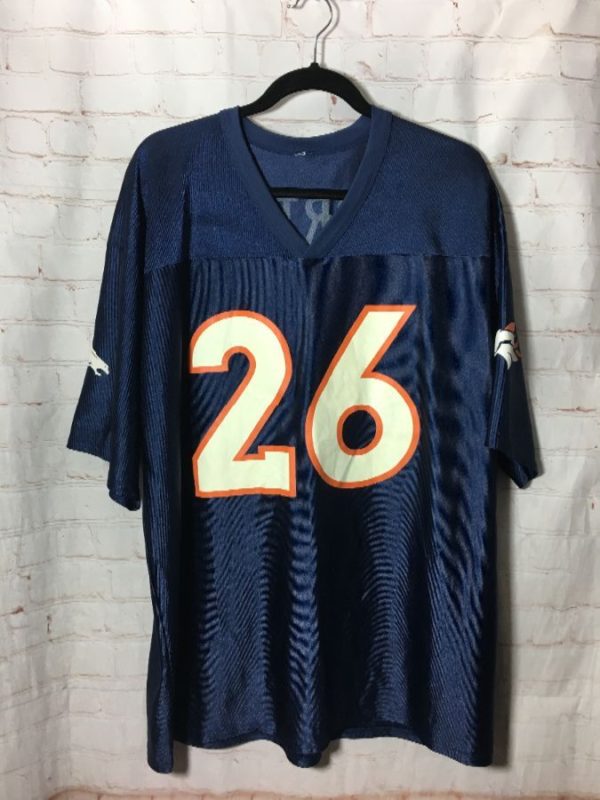 Football jersey, pullover, short sleeves, v-neck, Denver Broncos, #26 Portis, screen printed logos on both sleeves/large number full front/full back name & number, NFL, navy blue/white/orange, size XL