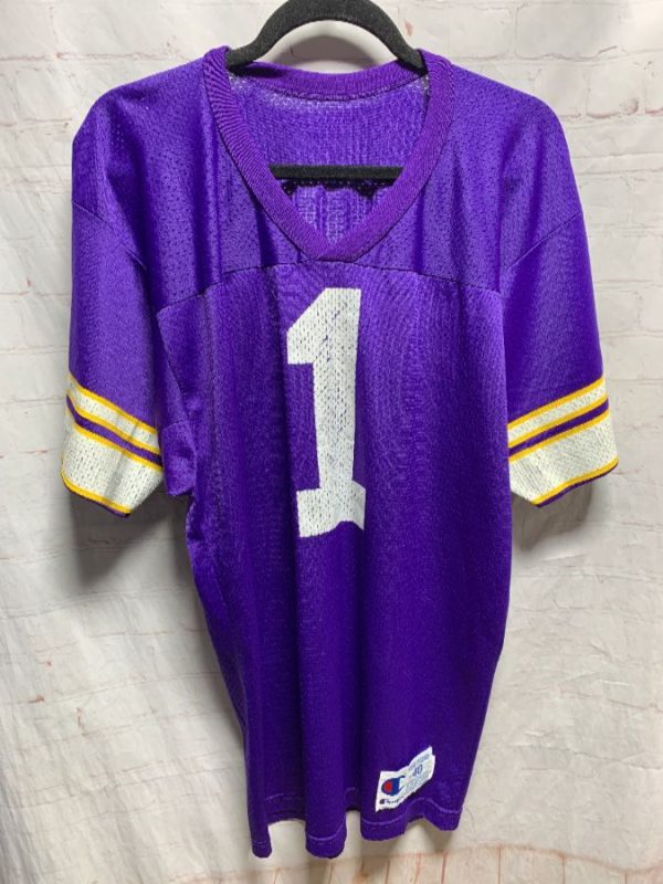 Champion football jersey, pullover, short sleeves, athletic mesh fabric, Minnesota Vikings, #1 Warren Moon, screen printed front and back numbers/letters/stripes, NFL, purple/white/yellow, size L
