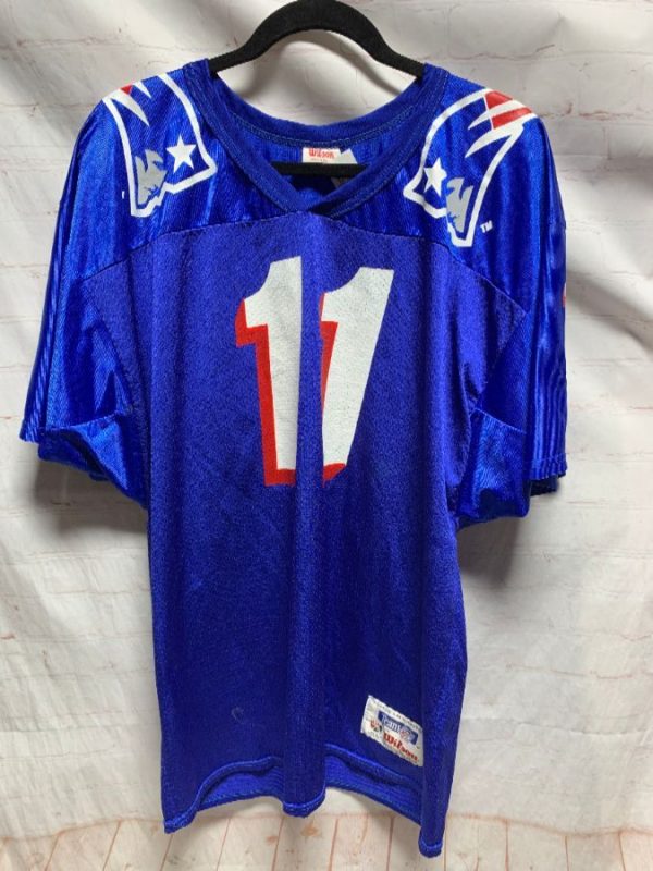 Wilson sports jersey, pullover, short sleeves, athletic mesh fabric, New England Patriots, #11 Bledsoe, NFL,