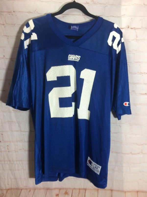 Champion football jersey, New York Giants, #21 Barber, screen printed lettering & numbers full front & full back designs, logo’s on both sleeves, blue/white, size L As is