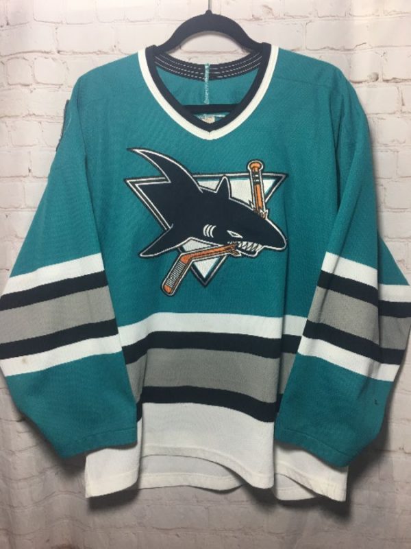 Mashka US Inc hockey jersey, long sleeves, v-neck, San Jose Sharks, color-block design with horizontal stripes on sleeves & body, striped neck trim, embroidered front shark with hockey stick design & shark fins in circle on both sleeves, teal/white/gray/black, size M As is