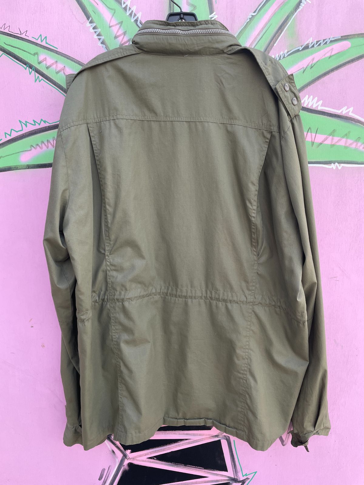 NICE! 1980S-90S MADE IN TAIWAN! OLIVE GREEN ZIP UP PARKA JACKET HIDE-A-AWAY HOOD