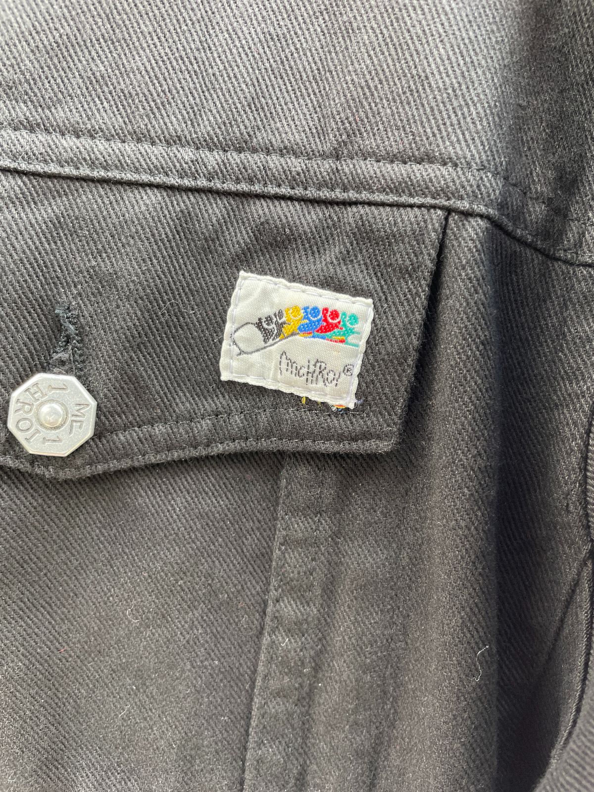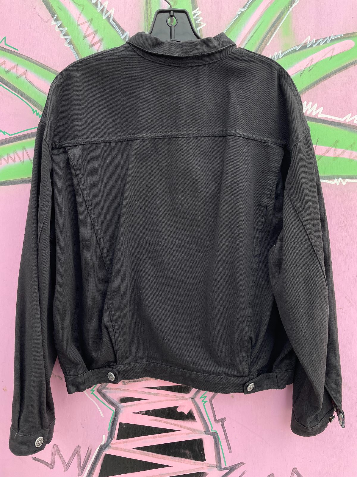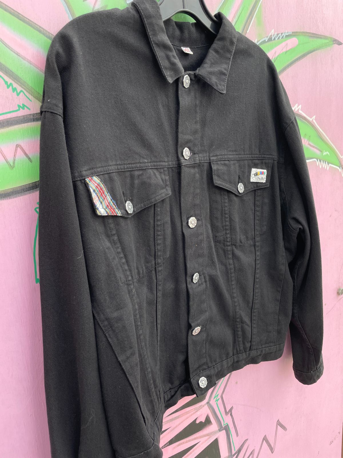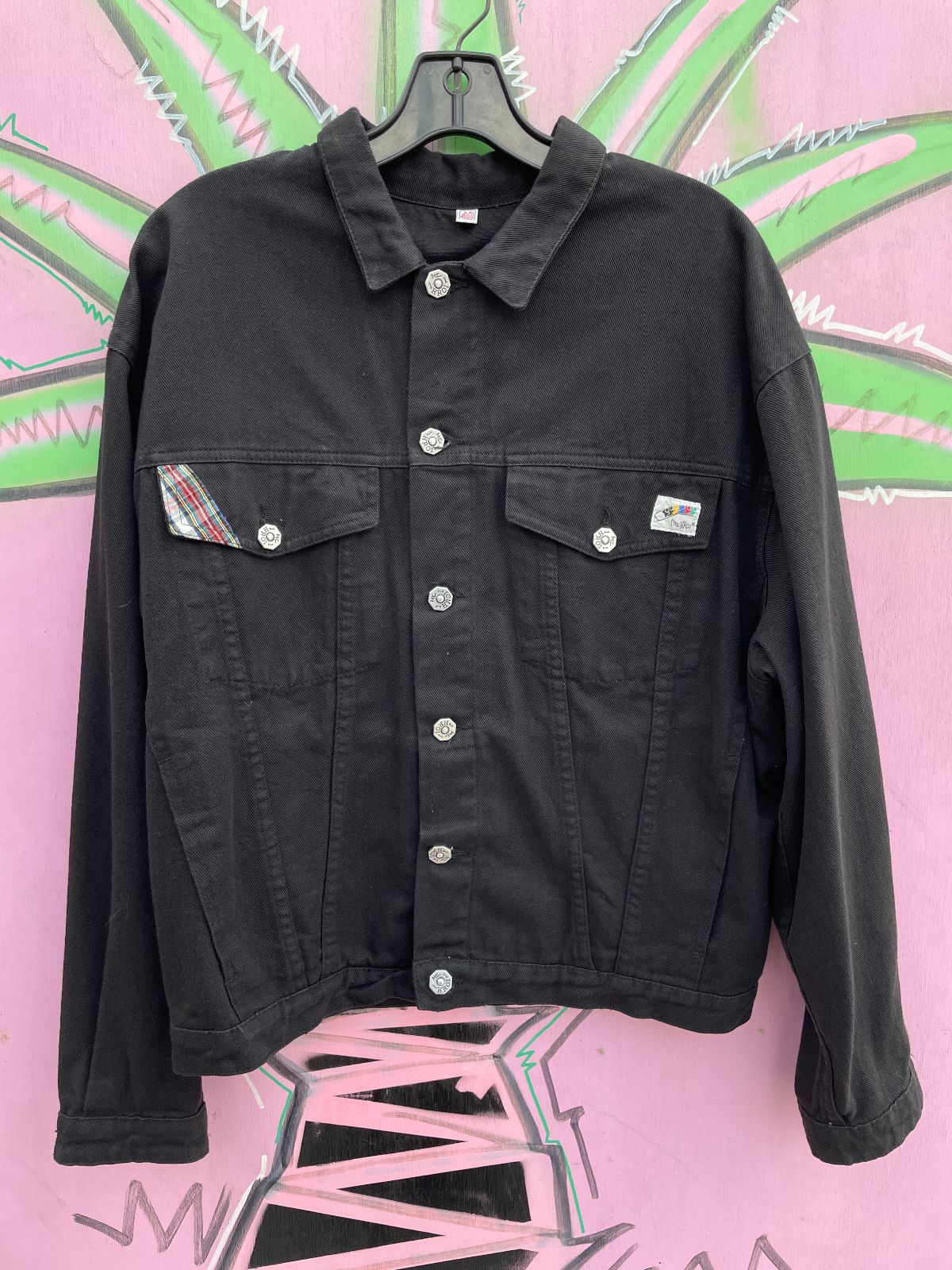 NICE! 1990S BLACK TWILL DENIM JACKET, PLAID DETAILS, FUNKY BUTTONS