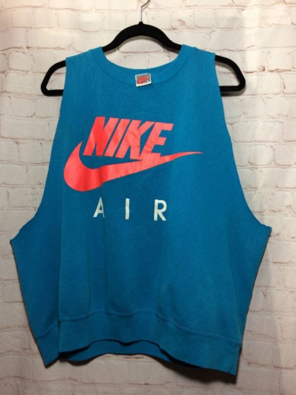 Nike Air sweatshirt tank top, cut-off sleeves, gray tag, screen printed front logo, blue/orange/white, size XL