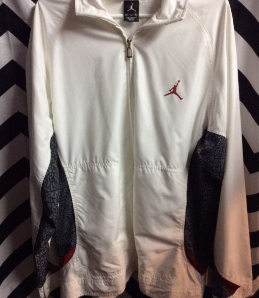 Nike windbreaker jacket, zip-up, Air Jordan, color block design, elephant crackle fabric, embroidered logo, white/red/gray, size XL