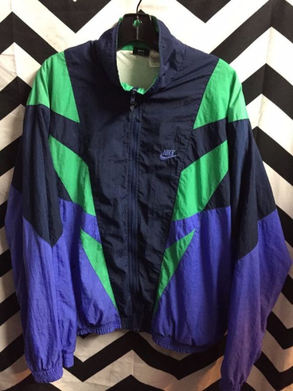 Nike windbreaker jacket, zip-up, color block design, embroidered logo left front, navy/green/periwinkle, size L as is