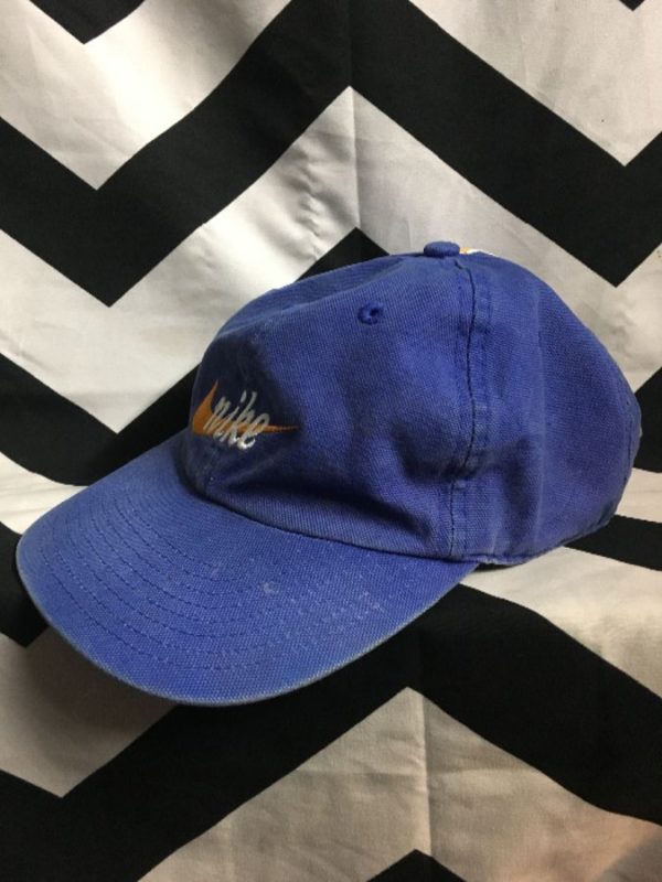 Nike dad hat, embroidered logo on front, stripe down back, blue/yellow/white, size adjustable