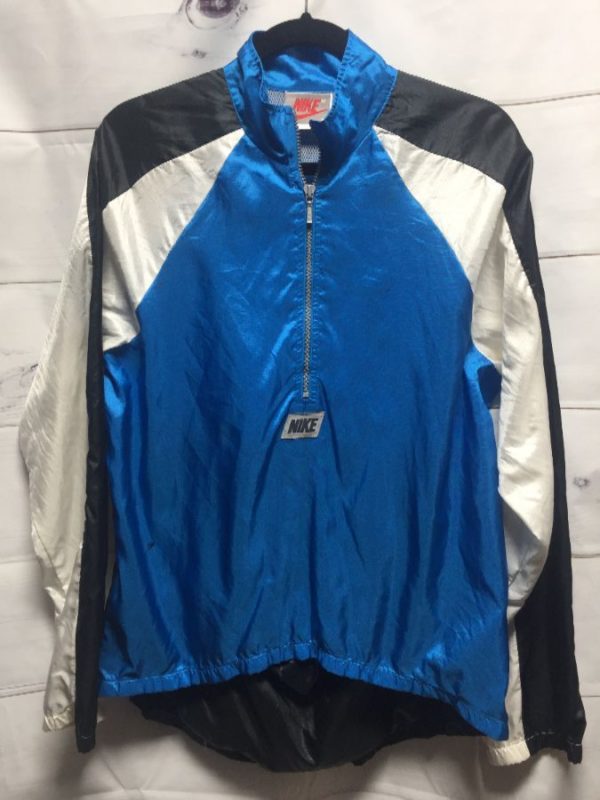 Nike windbreaker jacket, pullover, 1/2 zip-up, gray tag, small front & back logo patches, color-block design, black/white/black, size M