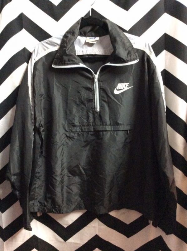 Retro Nike Windbreaker jacket, classic, pullover with partial zip-up, front pouch, striped sleeves, heat transfer logo, black/gray/white, size L as is